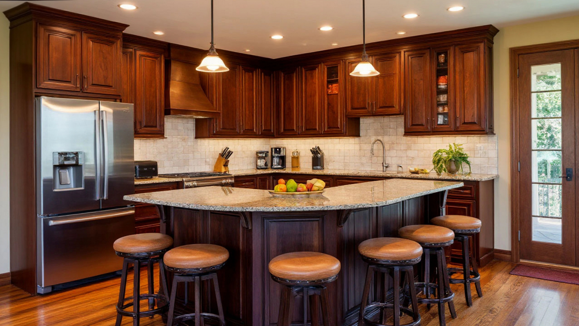 Цветовая палитра кухни играет ключевую роль в восприятии пространства. Глубокий коричневый цвет фасадов визуально согревает помещение, придавая ему камерность, но кухня не теряет легкости благодаря светлым элементам столешницы, металлическим вставкам и аккуратным декоративным акцентам. Такое цветовое решение подходит как для просторных, так и для компактных помещений, делая пространство гармоничным и комфортным.